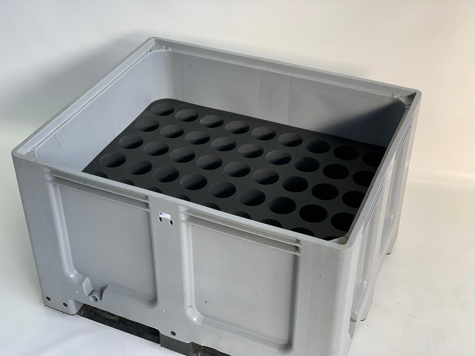 De klant had ons een kunststof stapelbak afgeleverd samen met een zuurstoffles. Hierna hebben wij een ontwerp gemaakt met de indeling van de zuurstof flessen. Na overleg met de klant en productie van een prototype is het ontwerp goedgekeurd. Vervolgens kon de productie van de resterende inlays voor de kunststof bakken worden uitgevoerd.